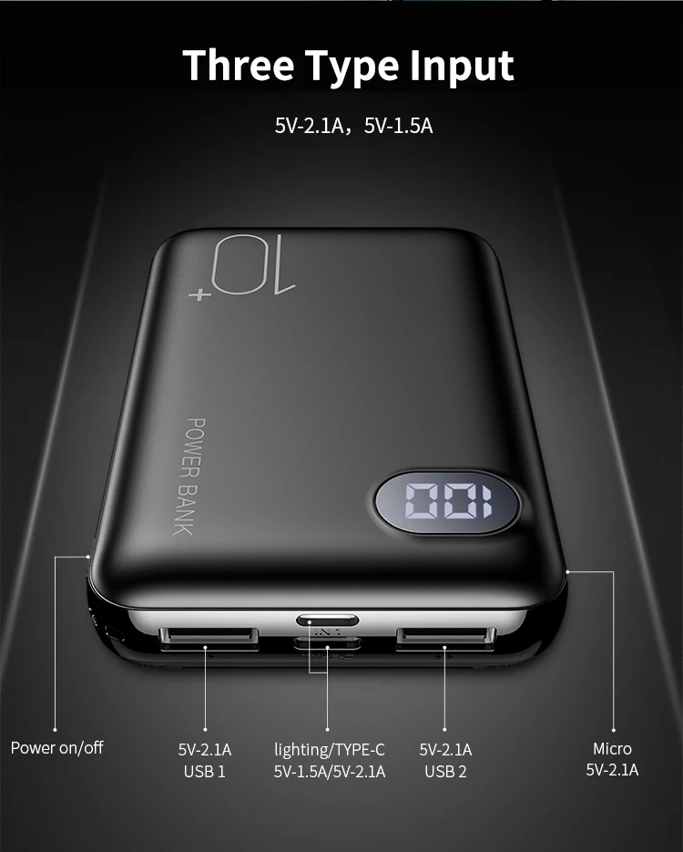 Feature | Double USB Ports Charging At the Same Time + Three Type Input + Mini Portable Pocket Power Bank |